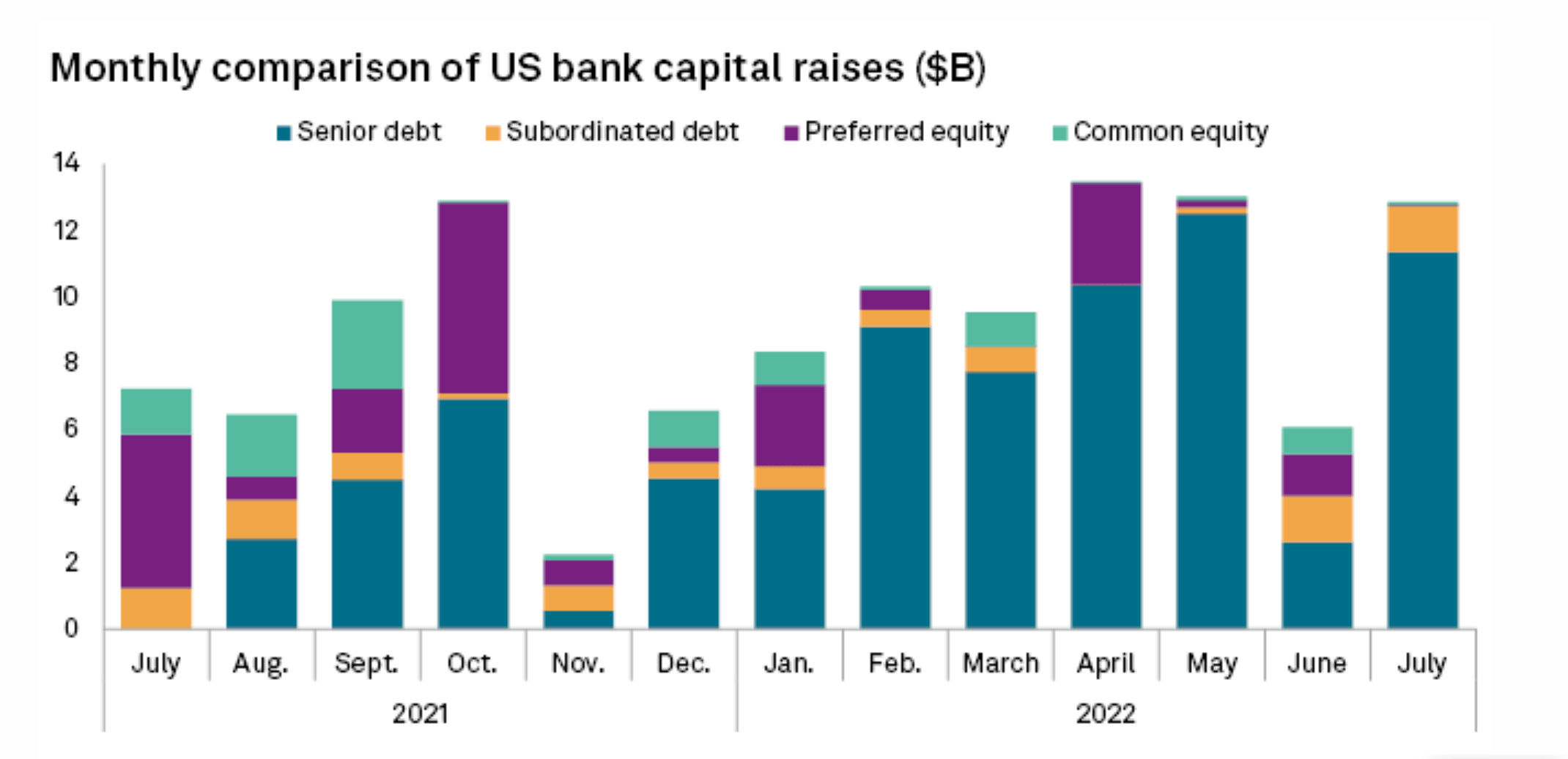 In July, capital raised by U.S. banks increased to $12.86 billion, according to S&P Global Market Intelligence data. This is a 111.5% increase from June, and a 77.7% increase year over year, the report found. The increase was driven by senior debt, which rose to 332.7% from June to $11.35 billion. However, there were decreases in common equity and preferred equity offerings. Common equity dropped to $82 million from $818.9 million in June, and  preferred equity fell to $30 million from $1.26 billion in June, according to the report.